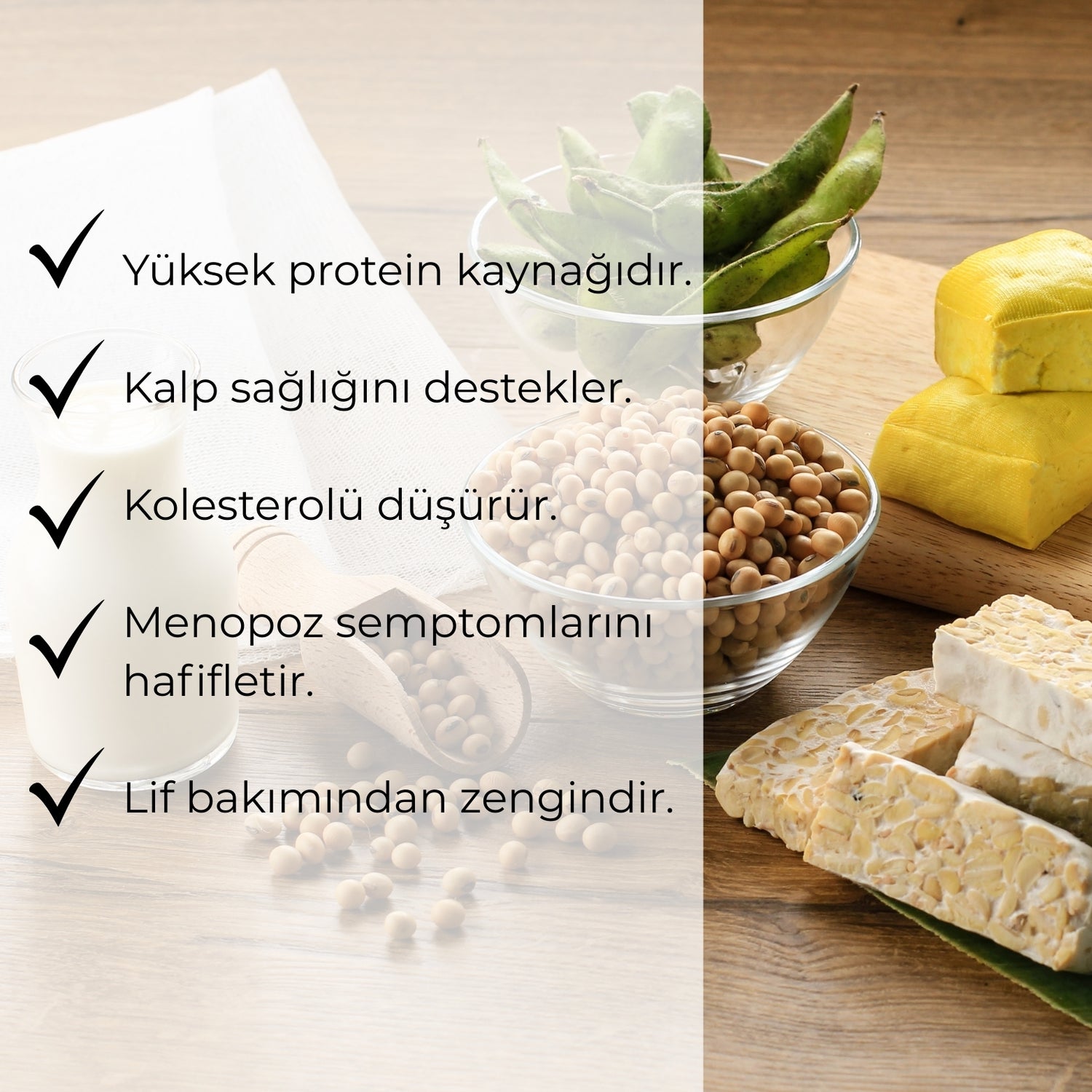 Kullandığımız soya, Çukurova bölgesinde yetiştirilen, GDO’suz ve üretiminde hiçbir kimyasal ilaç kullanılmadan üretilmektedir. Bu sayede sofranıza temiz, güvenilir ve gerçek bir bitkisel protein kaynağı gelir.